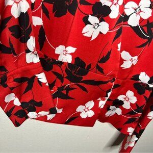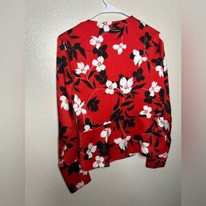 This stunning BCBGMaxAzria blouse features a vibrant red base adorned with a delicate white floral pattern, enhanced by a chic wrap style and a notched collar. The flowing fabric and elegant design make it a perfect choice for both casual outings and sophisticated gatherings.