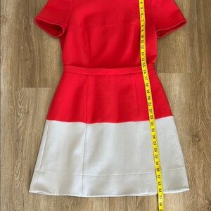 This chic mini dress by BCBGMaxAzria features a striking red and khaki color block design, perfect for casual or cocktail occasions. The short sleeves and crew neck add a classic touch, while the A-line silhouette offers a flattering fit. Crafted from a structured fabric, this dress ensures a polished and modern look. Please see photographs for approximate measurements length flat. This is a very well-made dress no stains, in great condition.
