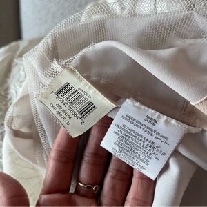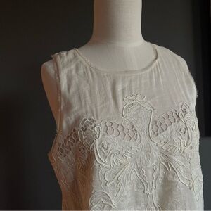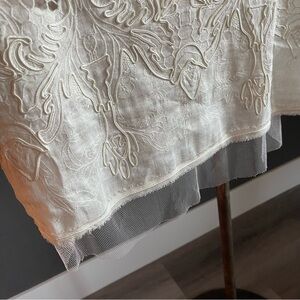 Chic mini dress with delicate lace overlay. Sleeveless design. Perfect for elegant outings. From the Spring 2011 Runway. Small stain as shown in photos. Hardly noticeable and can probably be treated and removed.