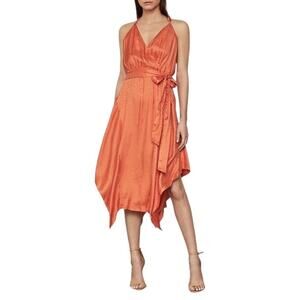BCBGMaxAzria Satin Handkerchief Midi Dress Orange Dot sz XS Halter Belt Wedding