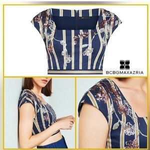 BCBGMaxAzria Sequin Glitter Cropped Top Blue with Yellow Stripes Fitted, XS