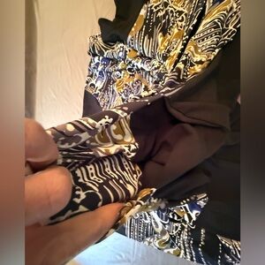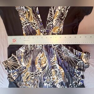 This stunning dress features a captivating black and gold design, perfect for any occasion. Its elegant style and intricate pattern make it a standout piece in any wardrobe.