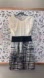 BCBG Max Azria silk dress. BCBG Max Azria, founded by Max Azria, stands for "bon chic, bon genre," a Parisian expression for "good style, good attitude". The brand, known for its contemporary and chic designs. The dress in the image features a two-tone design with a cream-colored silk top and a black and white patterned bottom, separated by a wide black band at the waist.