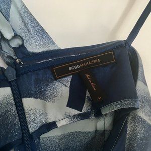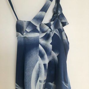 BCBGMaxAzria Silk Blue and White One Shoulder Blouse Top with bow detail.