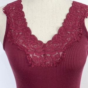 BCBG MaxAzria Ribbed Knit Lace Tank Top Silk Merlot V Neck with lace along the neckline slightly scalloped hem. Great layering piece