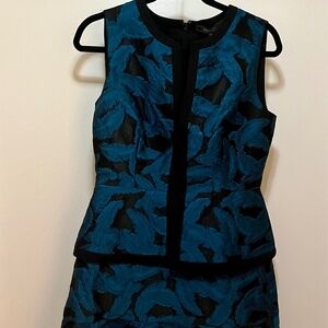 Textured and embossed highlighted teal feathers against shining black woven background. 100% poly - Deep split V neck - Contrasting black banded collar continues down dress front, peplum skirting, and dress hemline - Sleeveless - Fitted darted bodice - Hidden back zipper - 6” peplum skirt at waistline - POCKETS!! - Slightly a-line skirt - 6.5” flounce at hemline The illusion is that of a tiered skirt - Lined - 100% poly * a price tag photo is included with pics to verify MSRP. The dress on offer is preowned. Flat measurements: P2P- 17” Waist- 13.5” Hips- 18” Length- 33” EUC-
