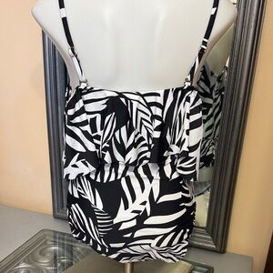 Chic swimsuit with bold leaf pattern. Features stylish ruffle detail. Ideal for a fashionable beach day. Has the sanitary liner but it keeps falling off.