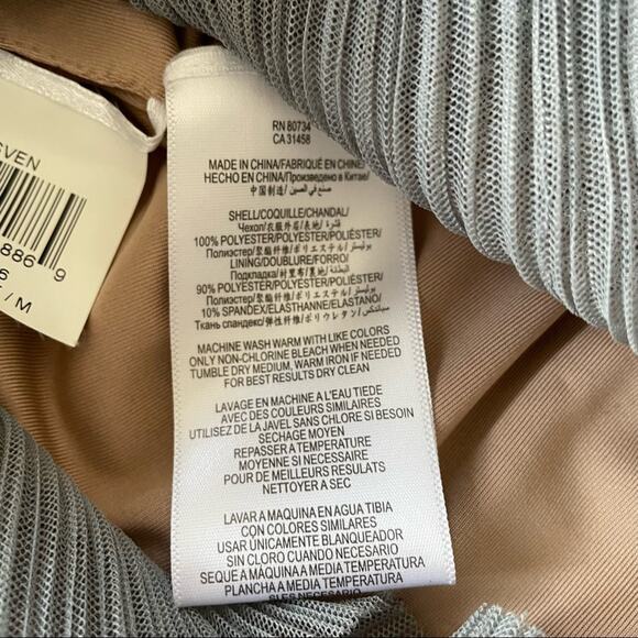 Sleeveless, v-neck, micro pleated throughout, sheer and fully lined in nude color