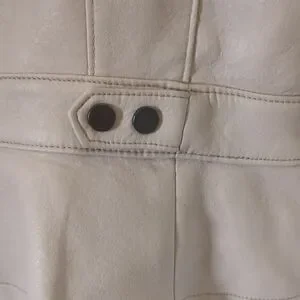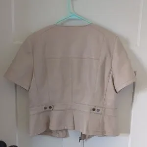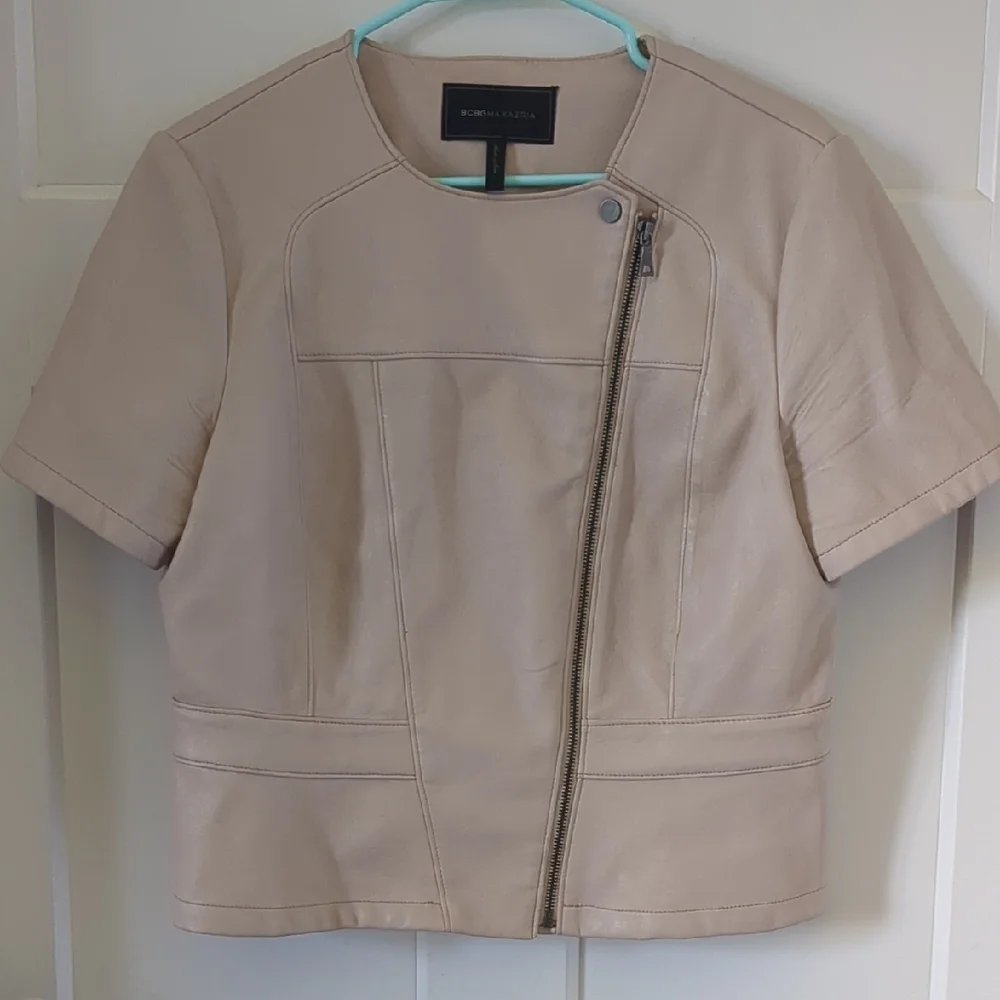 Faux leather with minimal wear. Cropped waist and cropped sleeves. Asymmetrical zipper with snap closure.
