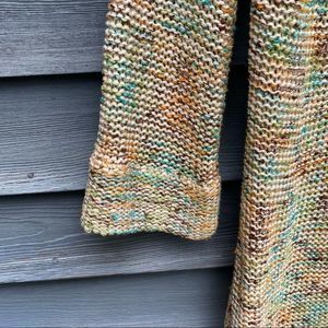 Tan knit cardigan with blue, orange and brown design