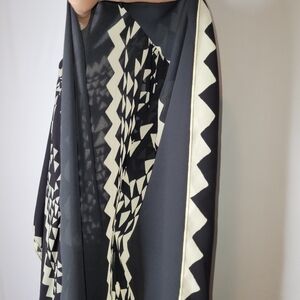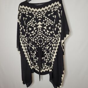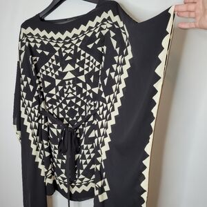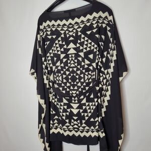 This BCBG Kaftan is stunning! Photos honestly don't do it justice! Perfect for an evening out or daily casual wear that steps your look up a bit. The tribal print is black and white making this item super versatile! Pair with denim, slacks and skits alike for a gorgeous look!