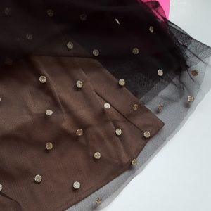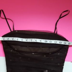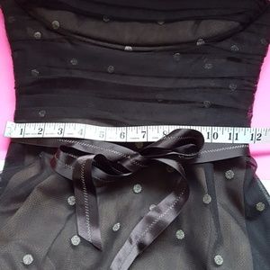 Beautiful party dress with gold polka dots. Spaghetti straps. Satin self-tie. Zippered back . Length: 47". Worn once.