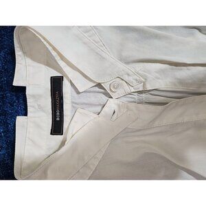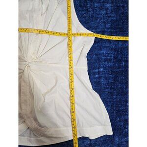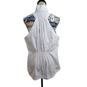 BCBGMaxAzria 100% luxury cotton white tuxedo dress shirt with unique feminine features in size Large. Super low V neck with ruched waist, elastic back to cinch in that silhouette! Wear with the neck button closed or open, there's so many ways to style this sexy top. Flat lay measurements: chest 17", length 25.5".
