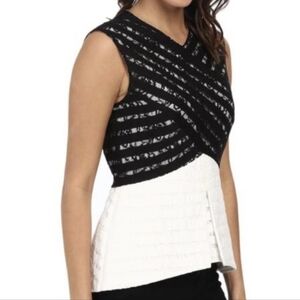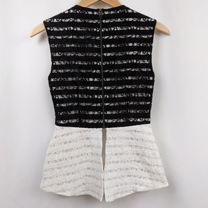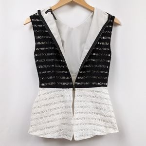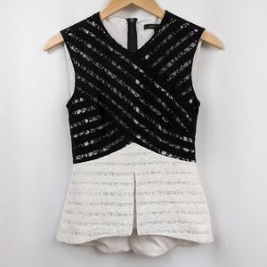 BCBGMaxAzria Vicki Lace Tuxedo Blouse Sleeveless Peplum Zip Back Black White XXS