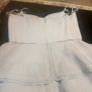 This elegant BCBGMaxAzria mini dress showcases a tiered skirt that adds a playful flair to its sophisticated design. The sleeveless silhouette is enhanced by delicate spaghetti straps and a sweetheart neckline, making it an ideal choice for a bride or cocktail event. Crafted in a pristine white shade, this sundress embodies timeless charm and grace.