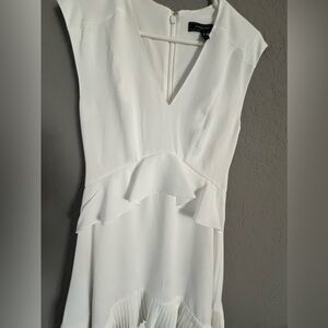 Elegant white dress by BCBGMaxAzria. Features pleated hem and V-neckline. Perfect for any occasion.