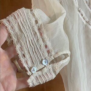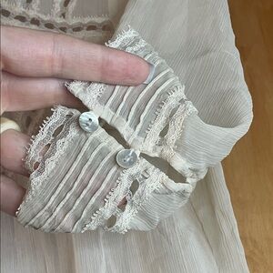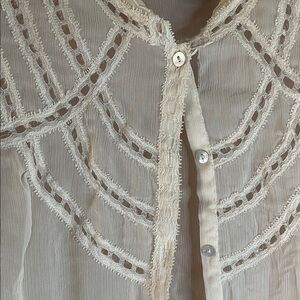 Elegant cream blouse with intricate lace detailing. Features button-up front and delicate sleeves. Perfect for sophisticated events.