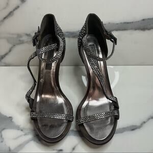 BCBGMaxAzria Women's Gray Studded Rhinestone Strappy Platform Peeking Heels Sz 7
