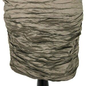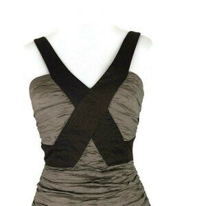 BCBG MaxAzria "Simsom" Cocktail Dress in size 2 in Mocha. Ruched bronze colored Tafetta with brown accent pieces. Body contouring. Adjustable Spaghetti Straps, zipper closure in the back. Polyester Nylon Cotton Blend, lined. Great condition.