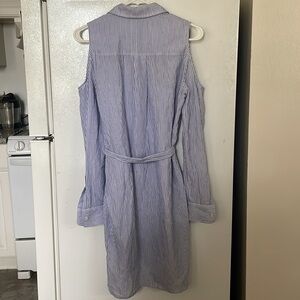 Stylish blue striped dress with cold shoulder design. Features long sleeves and a tie waist. Perfect for a modern look.