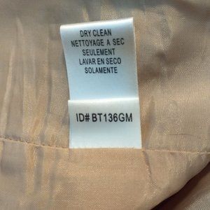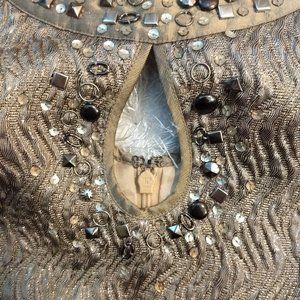 Gorgeous bronze dress has metallic shimmering threads and a 100% silk contrast by BCBGMaxAzaria. This dress features a round neck halter design that is embellished with metal studs, metal hoops, and sequins. The neckline features a keyhole cutout that is also heavily embellished. While I do not think that any of the embellishments are missing, it is hard to tell given the random placements of the hardware.
