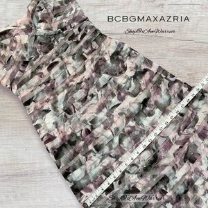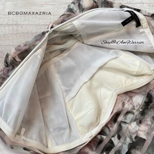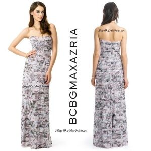 Gorgeous BCBGMaxAzia tiered floral strapless dress in lavender hues. Very popular dress. Stunning silhouette. Side boning, fully lined, back zip. There is a place to add straps (not included or shown on models/actress) if preferred. GUC w/ exception of small tear on bottom hem on mesh & slight discoloration around hemline as shown. Both barely noticeable when wearing. Retailed at $398 (tag not attached). Generously priced at $200 off! See photos for measurements. Dress has some stretch with the type of nylon fabric.