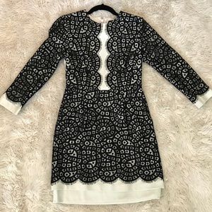 Perfect used condition. Only worn a couple of times. Measurements shown in photos. Dress has zipper in the back and is soft knit in a cream color with black lace overlay. 3/4 length sleeve with crew neck. Could be worn for formal event, as a cocktail dress, or for a wedding or party.