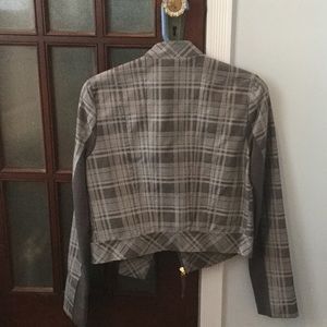 Gray and white BCBGMaxAzria lightweight, lined jacket. Zipper runs up the side of the jacket with 3 buttons near the collar. In excellent condition. Make me an offer if interested!