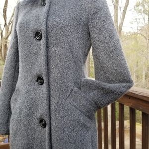 Size 6 charcoal gray and white mohair coat. This coat personifies sophistication and class. 4 front buttons and 1 extra sewn inside. 2 front slot pockets. Bottom back vent slit. Small pull on inside of left coat tail as pictured in photo 6.