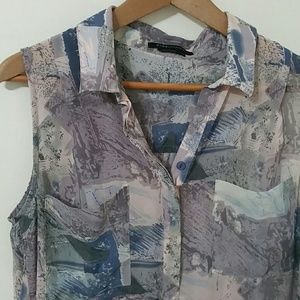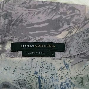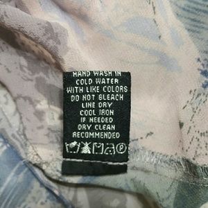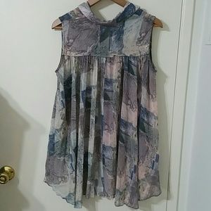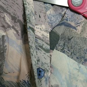 Size M. Gray and blue toned printed. 2 front pockets. Hidden front buttons. Lightweight and flowy. Flirty high low fishtail at hem. Slight pull at front buttons but is covered (pic 7)