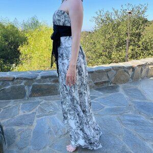 This BCBGMaxAzria strapless, floor-length gown features a stunning black and white toile print and a wide, flattering black sash. It's a classic and timeless chiffon dress for a summer wedding or other formal or semi-formal occasion. Women's size 6 regular. Current length should be perfect for someone approximately 5'6" in heels to approximately 5'9" without heels. Worn once.