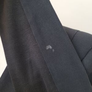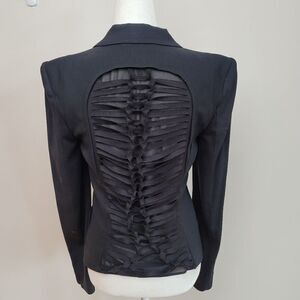 One button closure. Shoulder pads (not removable). Sleeves have a ribbon of stretchier material from shoulder to tip.