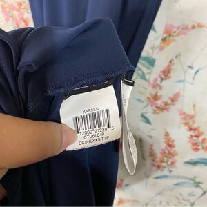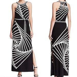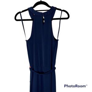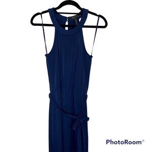 BCBG Maxazria maxi dress. navy blue solid color, side slit, tie waist. Excellent used condition