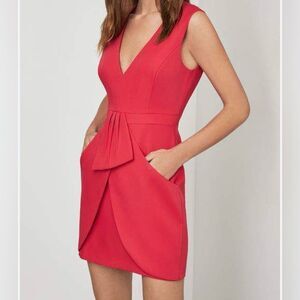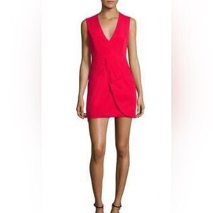 This striking red mini dress by BCBGMaxAzria features a sleeveless design with a daring plunge neckline and a draped skirt dress that adds a touch of drama. Perfect for a cocktail night out, its sheath silhouette ensures a flattering fit, making it a standout piece for any evening occasion. Gently worn (only worn once). See photos for measurements.