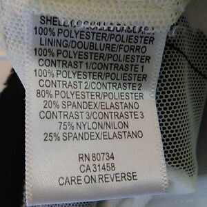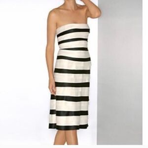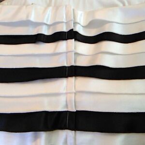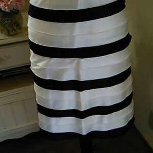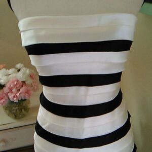 Beautiful horizontal stripes in black and white and white satin. Support and a built in bra shape the top. Tape at the top secures the top. Back zip. A shaped skirt. Size 2 is tiny, won't zip up on my mannequin. Size 2 measures 30 at chest, 25 at waist, 36 at hips, 32 long from top of chest to bottom. Beautiful and unusual for your special event.
