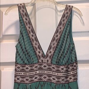 BCBGMaxAzria Silk Maxi Dress, size 2. Green with navy, brown, cream and mustard. Brown and bronze sequin embellishments. This is a stunning dress that you will make a statement wearing! Gorgeous! Perfect condition!