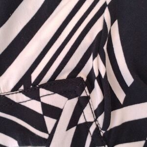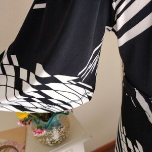 Floaty fabric is soft and comfortable. Square neck with stitch trim. Gathered at chest and at band under chest. Modern black and white graphics. Kimono shape sleeves. 35 long from shoulder to hem. Size L measures 42 at chest, 36 under chest, full skirt. So pretty and SO comfy.