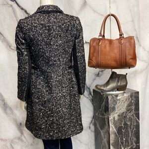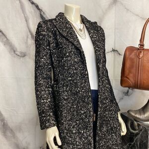 BCBG MaxAzria coat black white tweed Excellent condition no damage fabric 80% wool 10% nylon 10% acrylic 17 inches across laying flat under armed under arm shoulder to bottom is 35 inches