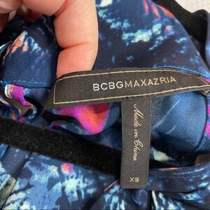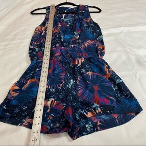 BCBGMaxazaria ‘Thalia’ V Neck Romper in Dark Tropical Print. Color is ‘CarbonMulti’. Size extra small with measurements in the pictures. Gently used condition with no rips or stains.