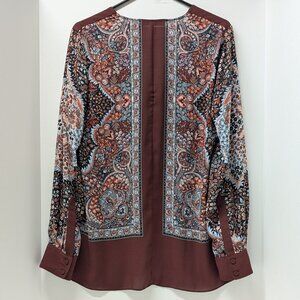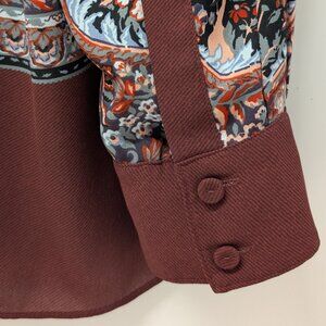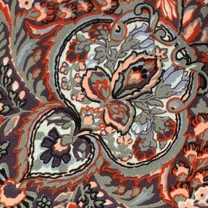 Colors: Solid color is maroon. Primary colors in the print are pastel pink, orange, blue, white, gray, and purple.