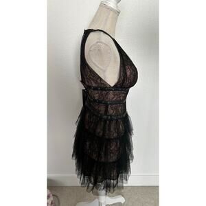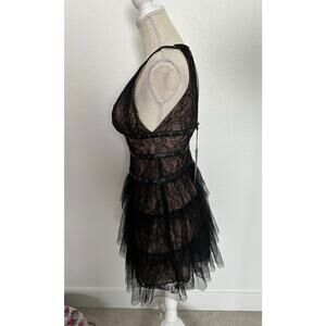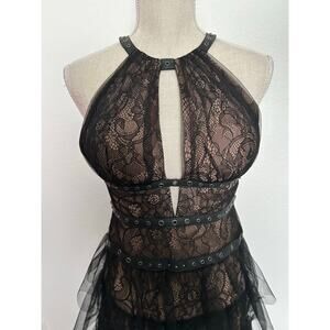 This dress pulls out all the style stops. It is a black lace mini dress that has a nude underlay. The lace is accented by tiered tulle down the skirt. It also has a fun rock and roll flair as there is faux leather and grommets that accent the waist. The bustline features a deep V with keyhole cutouts and it has padding in the cups. The neckline is a halter style that has snap closures in the back. There is a hidden zipper in the back I did not want ot force it closed so I left a little open on the mannequin. This dress has a gothic or rock and roll style to it. New with tags.
