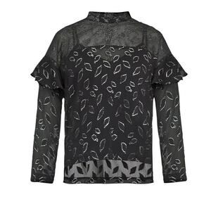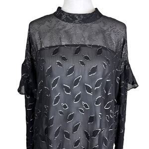 BCBGMaxazria Black Sheer Chiffon Silver Metallic Leaf Print High Neck Blouse