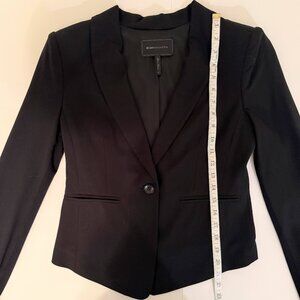 BCBGMaxazria classic workwear blazer in black. Long Sleeves, lined, single button front, long rounded collar. Unique 5 button cuffs, stylish slightly cropped length and low open neckline. Perfect career jacket for the office, or dress down with jeans for a night out! Excellent used condition, no fabric/care tag. Women's size S small, measurements pictured.