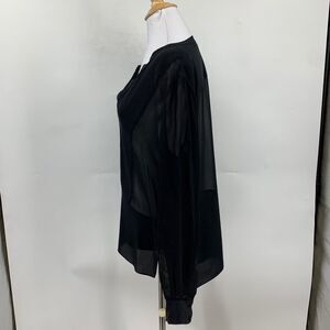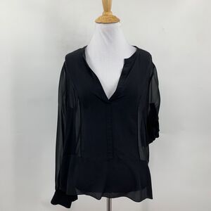 BCBGMaxazria Blouse Women M Medium Black Silk Semi Sheer Panel Tab Sleeve V Neck
