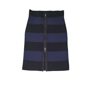 BCBGMaxazria Blue and Black Striped Bandage Bodycon Mini Skirt. Thick, stretchy material. Zipper down the back unzips both up and down to create a slit in the back. Excellent condition. Size small.