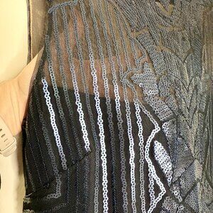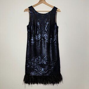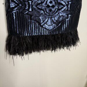 BCBGMaxazria navy blue cocktail dress with black feather and mesh fringe. Festive sequin pattern, mesh at top and on shoulders. Bottom has black feathered fringe. Great Gatsby, flapper, 1920 themed.