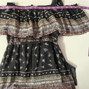 The prettiest boho black tiered off-the-shoulder maxi dress with a cute colorful print and tie at the waist. NWT. Never been worn. Perfect for the Summer with sandals or a cute heel! Approximate measurements shown in photos. Feel free to ask questions or make an offer!