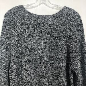 BCBGMaxazria women's chunky knit marled sweater. Black, gray, and white. V-neck. Long sleeves. Ribbed trim. Relaxed fit. In good used condition. No visible flaws.