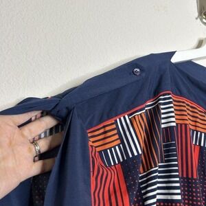 This BCBGMaxazria dress features geometric patterns in shades of blue, red, orange, etc, perfect for any occasion from travel to business meetings. The boat neckline and dolman short sleeves with button tabs adds a fun touch to the knee-length dress. The blouson style with fitted bottom gives a trendy look, and the polyester-spandex jersey fabric with stretch accents provides comfort and ease of care with machine washable garment care. Whether you're attending a wedding or a cocktail party, or just want to dress up for a casual day out, this dress is a must-have for any wardrobe. PLEASE NOTE: Under very bright light it looks like a stain under the pattern in the waist area. That is just part of the fabric. Not a defect and can't be seen in normal light. All measurements are approximate and taken flat.
