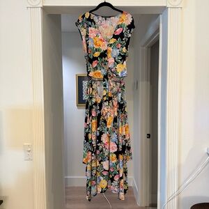 BCBGMaxazria Floral Assymetric Hem Tie Front Cut Out Knee Length Dress Sz Large